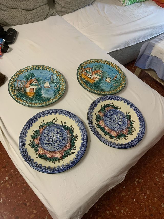 Dettagli del prodottoSet di quattro piatti decorativi in ceramica, ideali per appendere alla parete e aggiungere un tocco artistico alla tua casa. Ogni piatto presenta un design unico e colorato. - Due piatti con scene marine e case. - Due piatti con design di cherubini e fiori. La descrizione è stata tradotta automaticamente.