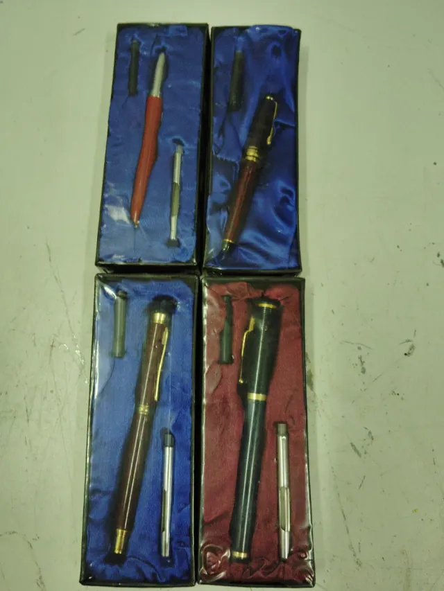 Dettagli del prodottoSet di quattro penne stilografiche presentate nei loro astucci individuali. - Penna di colore rosso. - Penna di colore granato. - Penna di colore marrone. - Penna di colore nero. La descrizione è stata tradotta automaticamente.