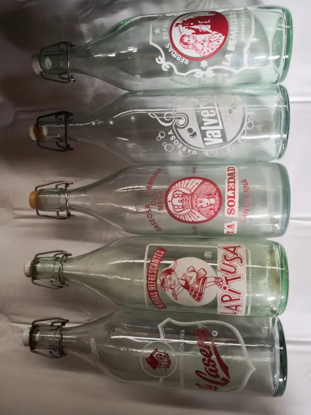 Dettagli del prodottoSet di cinque bottiglie di gassosa antiche, perfette per collezionisti o decorazione. - Bottiglia La Bembibrense - Bottiglia Valverde Gassosa - Bottiglia La Soledad - Bottiglia La Pitusa - Bottiglia Casera La descrizione è stata tradotta automaticamente.
