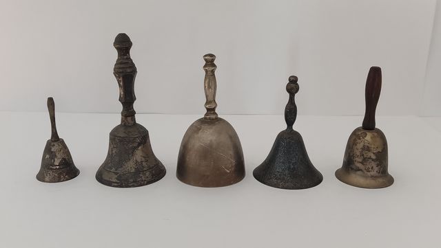 Dettagli del prodottoVengono vendute cinque campane antiche in alpaca e argento. Sono disponibili in diverse dimensioni e mostrano segni di utilizzo, conferendo loro una patina unica.