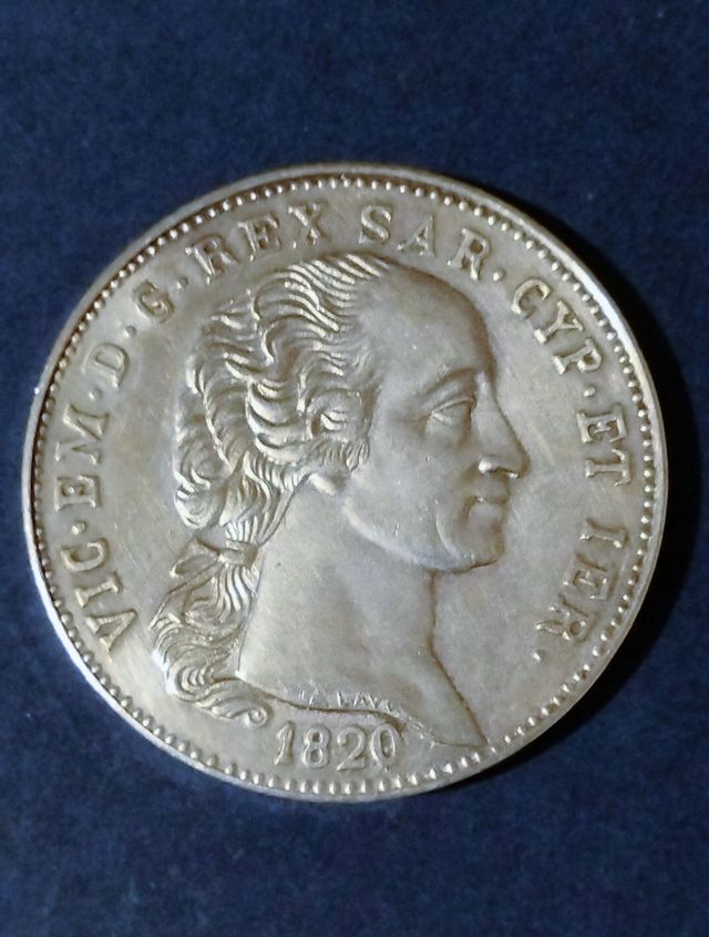 Bellissima riproduzione in argento: moneta d'argento da 5 lire raffigurante Vittorio Emanuele I, coniata nel 1820.