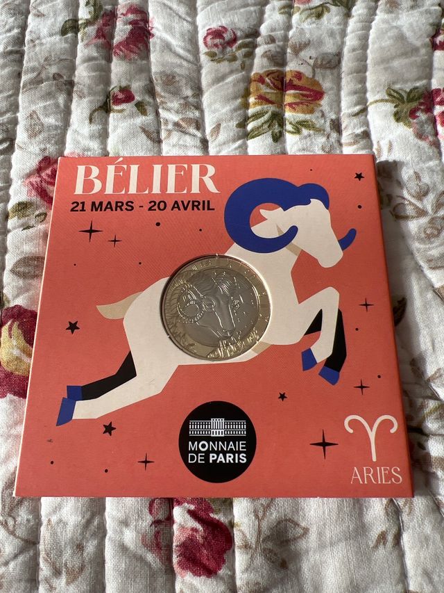 Dettagli del prodottoMoneta commemorativa da 5 euro della Francia dedicata al segno zodiacale Ariete. Edizione della Monnaie de Paris. - Design dell'ariete (Ariete). - Data: 21 marzo - 20 aprile. - Timbro della Monnaie de Paris. La descrizione è stata tradotta automaticamente.
