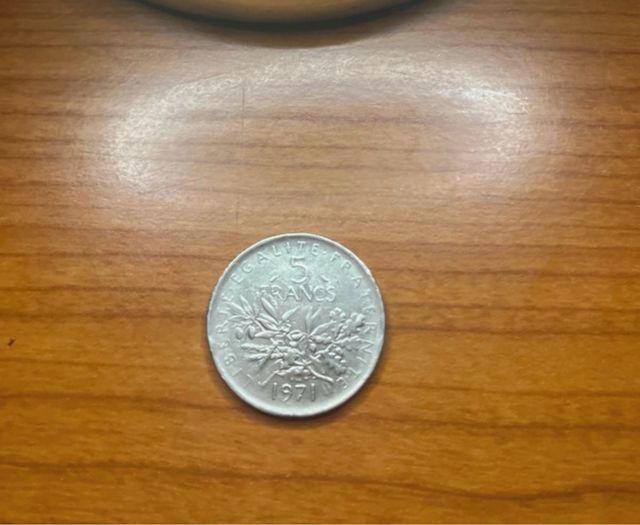 Moneta da 5 Franchi del 1971. moneta rara errore di conio - Dettaglio EGALITE FRATERNITE sul bordo. - Raffigurazione di spighe di grano e ramoscelli