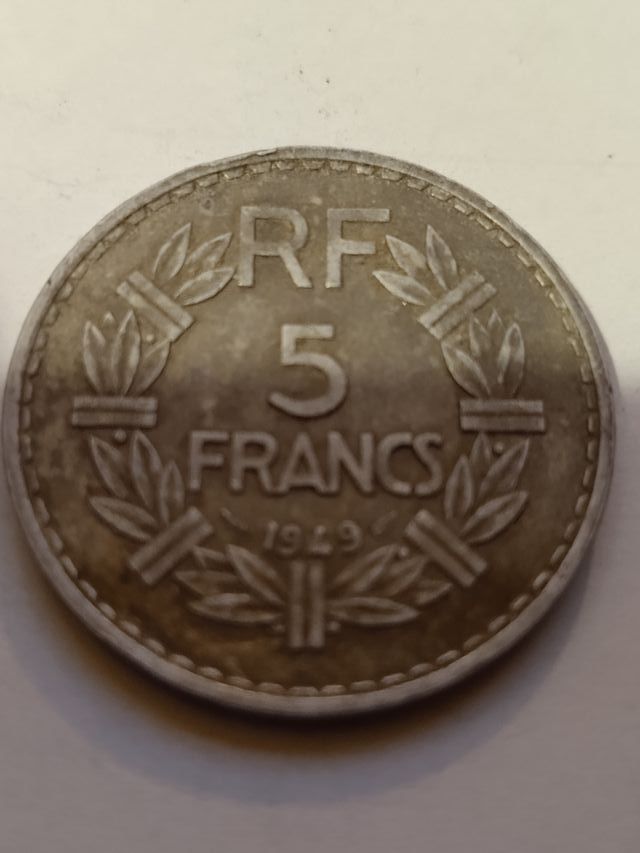 Moneta da 5 Franchi Francesi del 1949. - Dritto: RF (République Française) e 5 FRANCS. - Rovescio: Anno 1949 circondato da rami di alloro.