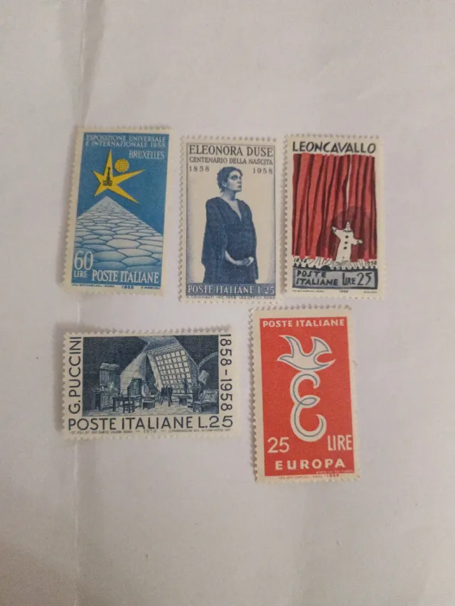 Dettagli del prodottoLotto di 5 francobolli italiani nuovi, emessi tra il 1956 e il 1958.