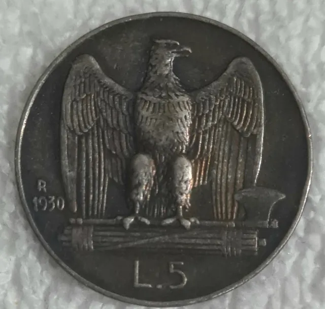 Dettagli del prodottoMoneta italiana da 5 Lire del 1930, con aquila e fascio littorio.