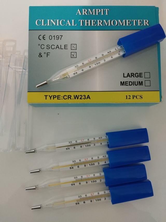 Dettagli del prodottoSet di 5 termometri clinici a doppia scala Fahrenheit e celsius , per la misurazione della temperatura ascellare, tipici degli anni '80/'90. Ideali per collezionisti o per chi cerca un oggetto dal sapore retrò.