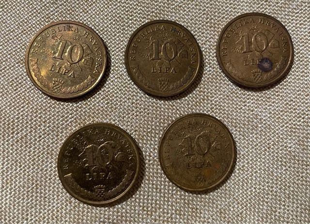 Lotto di 5 monete da 10 LIPA della Repubblica Croata. - Valore nominale: 10 LIPA - Paese: Croazia - Quantità: 5 pezzi