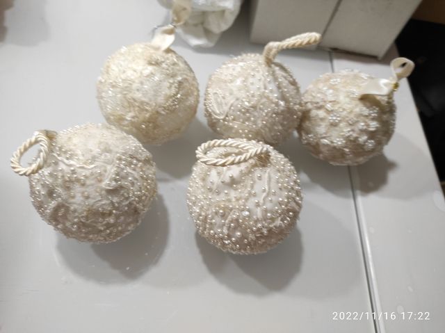 5 Palle di Natale bianche, completamente decorate a mano. Mai utilizzate.