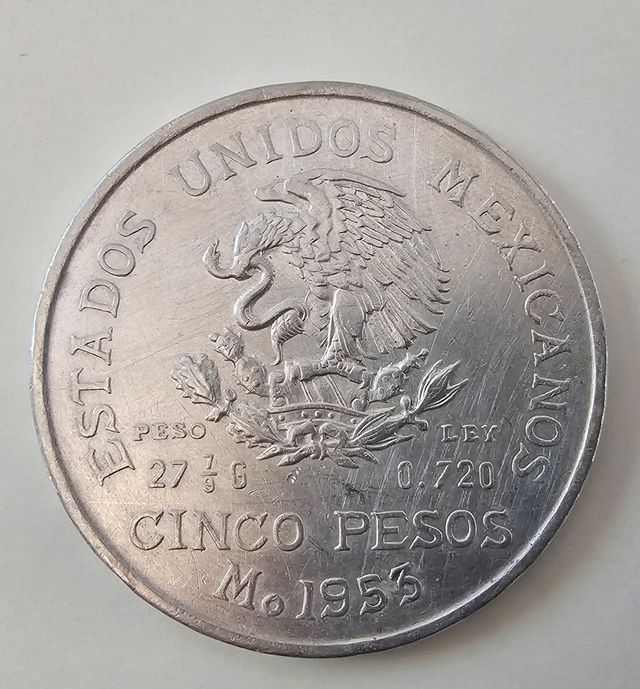 Moneta da 5 pesos messicani del 1953 in argento. - È una moneta d'argento. - È datata 1953. - Presenta il ritratto di Hidalgo e lo stemma messicano.