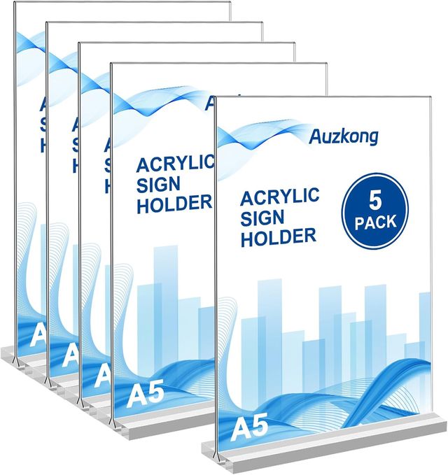 Dettagli del prodotto5 Pack Porta Cartelli in Acrilico A5, Espositore Verticale Entrambi i lati, Porta Carta in Plastica, Espositore da Tavolo a Forma di T, Espositore per Menù da Tavolo per Ristoranti Hotel Negozi