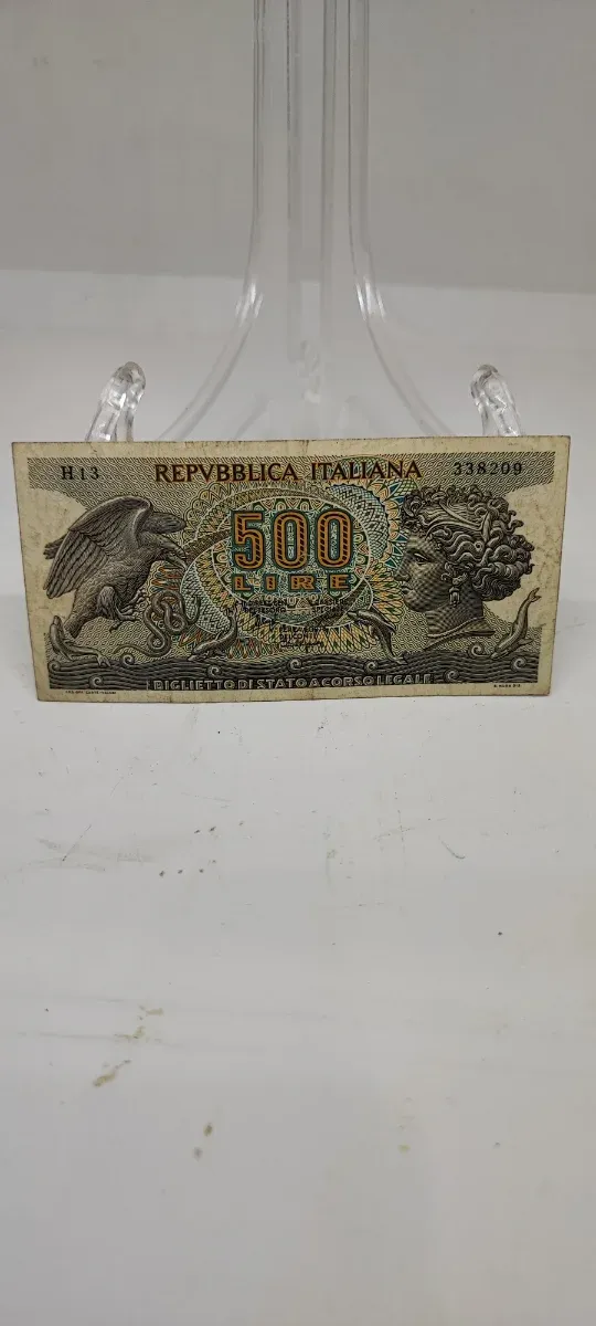 Banconota da 500 Lire della Repubblica Italiana. - Stampa BB - Raffigurazione di un'aquila e una figura femminile. - Dettagli intricati e colorati.