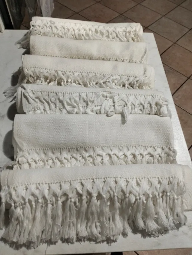 Set di sei asciugamani vintage in cotone, dal classico colore bianco. Presentano dettagli decorativi con frange che aggiungono un tocco di eleganza.