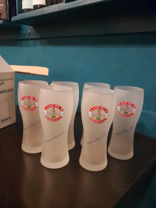 Set di 6 bicchieri da birra con logo Blanche de Bruxelles. - Bicchieri in vetro satinato. - Design con logo e scritta Authentic Belgian Beer.