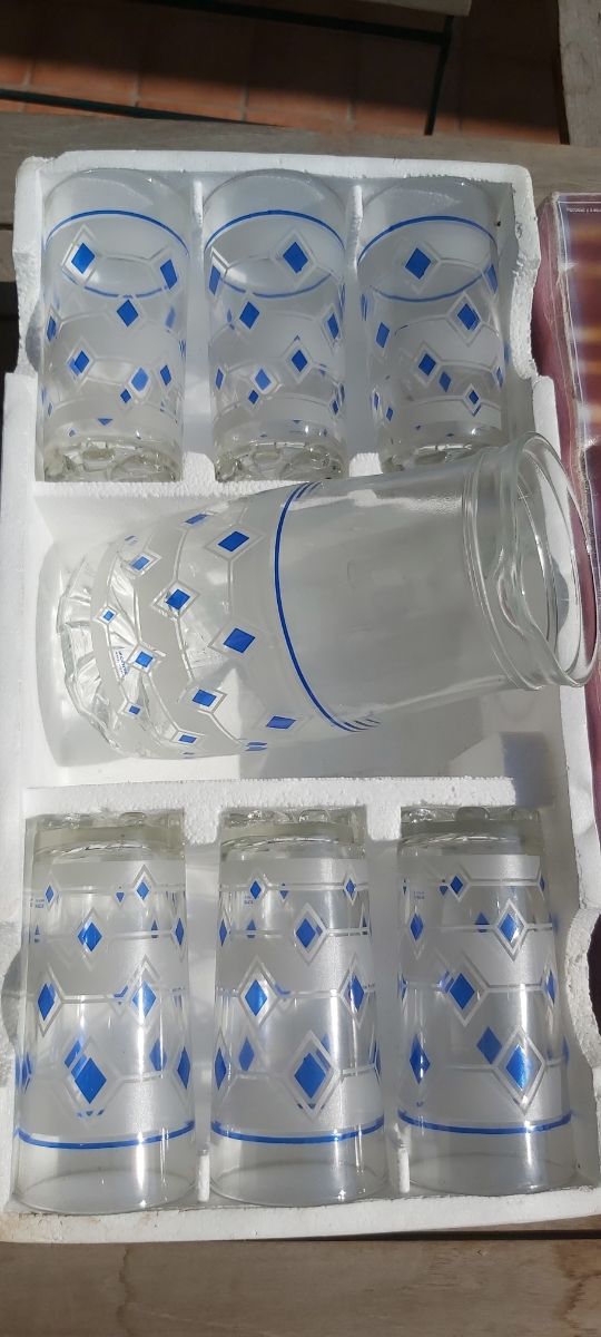 6 bicchieri vetro con brocca tutto perfettamente integri ,mai usati ancora in scatola.
