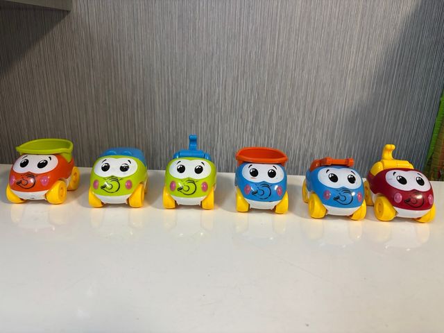 Dettagli del prodottoSet di sei passeggini giocattolo per bambini. Design vari e colorati, ruote funzionali per rotolare, facce simpatiche ed espressive. La descrizione è stata tradotta automaticamente.