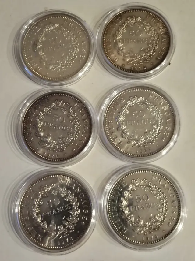 Dettagli del prodottoSet di sei monete da 50 franchi francesi, coniate tra il 1974 e il 1979. Serie completa incapsulata. È possibile aggiungere anche una moneta da cinquanta franchi del 1980 al lotto per 100 euro in più. - Design: Repubblica Francese con corona di allori e il valore 50 FRANCS. La descrizione è stata tradotta automaticamente.