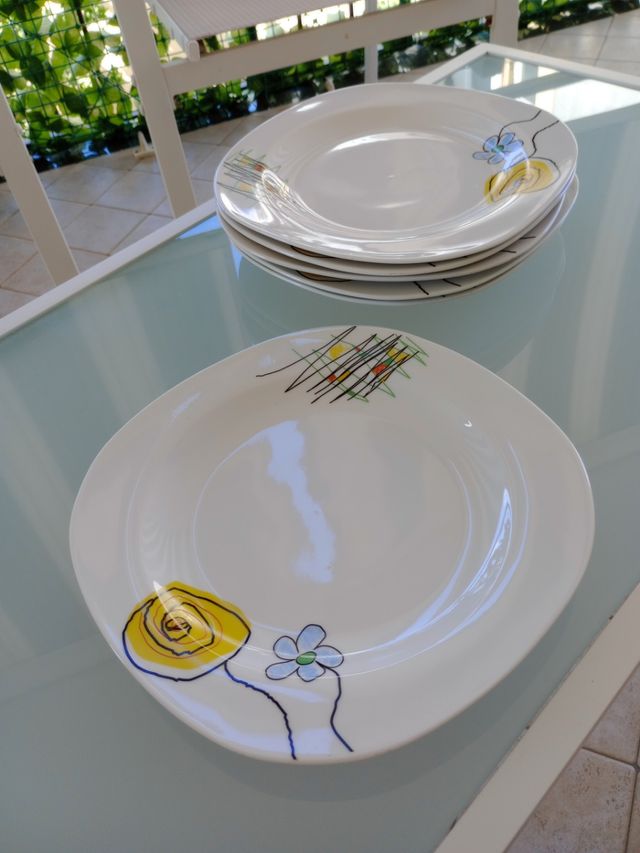 6 piatti piani quadrati cm 26x26.Possono presentare qualche puntino come fotografato.