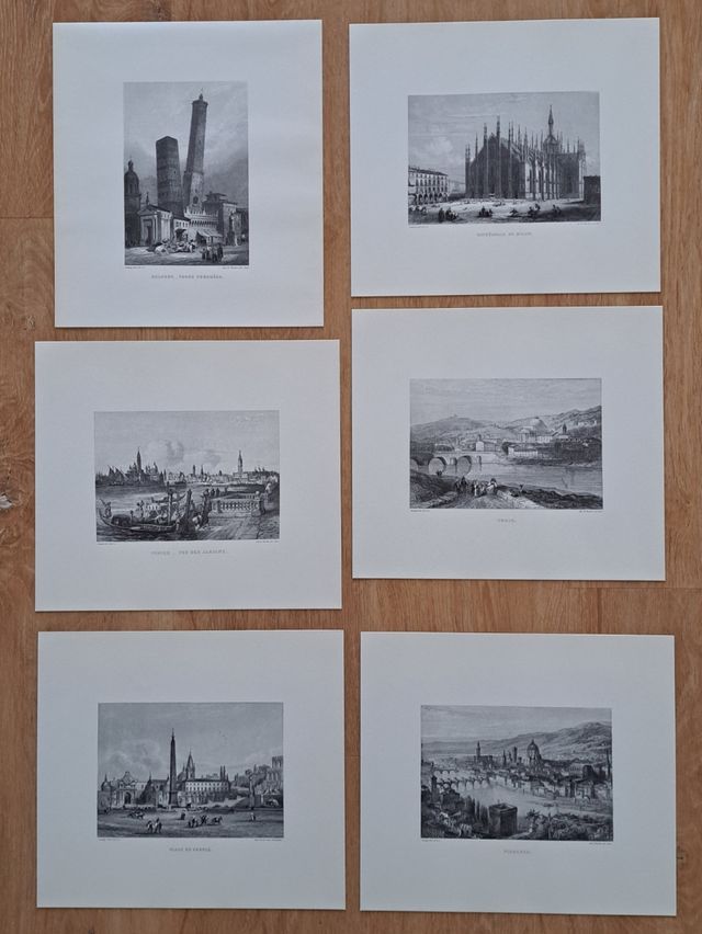 Dettagli del prodottoCartellina Voyage pittoresque en Italie par M. Paul De Musset contenente n. 6 stampe in bianco e nero, rappresentanti le principali citta' italiane: Milano, Torino, Bologna, Venezia, Firenze, Roma. In perfette condizioni.