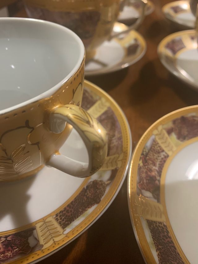Servizio da te composto da 6 tazze più sei piattini. Praticamente aperto e riposto nella credenza, mai usato. Decorazione stile animalier.