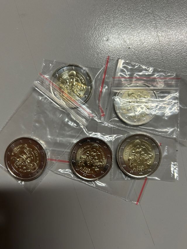 Lotto di 7 monete da 2 euro della Slovenia, coniate nel 2025. - Monete da 2 euro. - Anno di conio: 2025. - Provenienza: Slovenia. - Quantità: 7 pezzi.