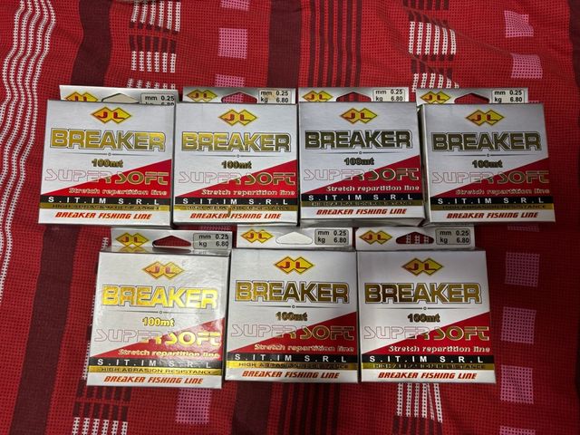 Vendo 7 scatole di filo da pesca marca Breaker. - Diametro: 0,25 mm - Carico di rottura: 6,80 kg - Lunghezza: 100 mt - Modello: Super Soft