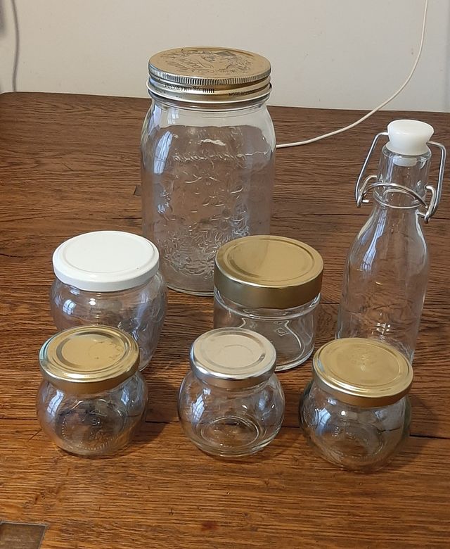 7 contenitori in vetro lavati ed igienizzati. 3 diam cm 5,5 circa 2 diam cm 6,0 circa 1 barattolo 4 Stagioni Bormioli diam. Cm 9 circa 1 bottiglietta altezza cm 15