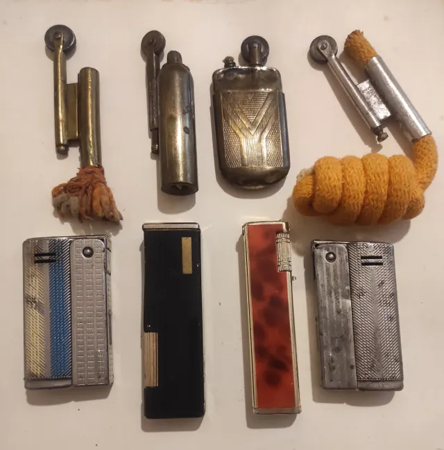 Dettagli del prodottoLotteria di 8 accendini antichi di diversi modelli e materiali. Una collezione unica per collezionisti. - Accendino in ottone con miccia. - Accendino metallico argentato con dettagli. - Accendino con design geometrico. - Accendino con fodero arancione. - Accendino argentato con linee verticali. - Accendino nero con dettagli dorati. - Accendino con finitura tartaruga. - Accendino metallico con incisione. La descrizione è stata tradotta automaticamente.
