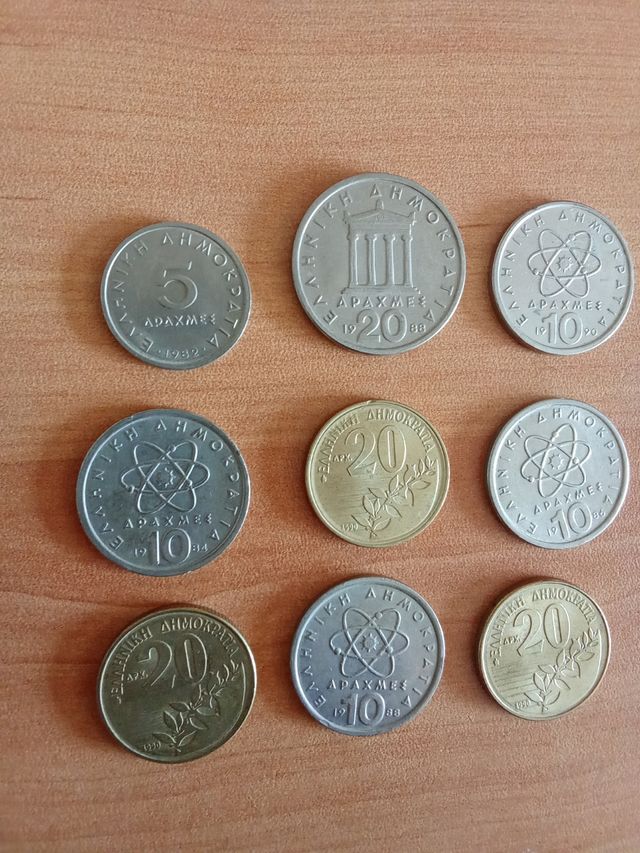 Set di 9 monete greche. - monete da 5, 10 e 20 dracme - Vari design con simboli ed edifici greci.