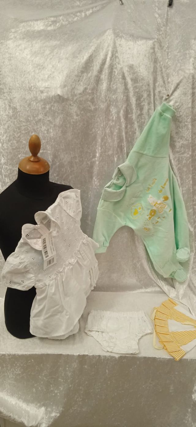 Dettagli del prodottoPrezzo al pezzo, Una tutina in ciniglia colore verde, Vestitino con culotte cotone sangallo e 1 berrettino ricamo baby. Offerta per chi prende tutti e 3 i pezzi 25,00 euro.