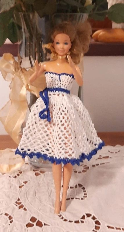 Dettagli del prodottoAbito per Barbie, realizzato artigianalmente all'uncinetto in cotone color bainco e blu.