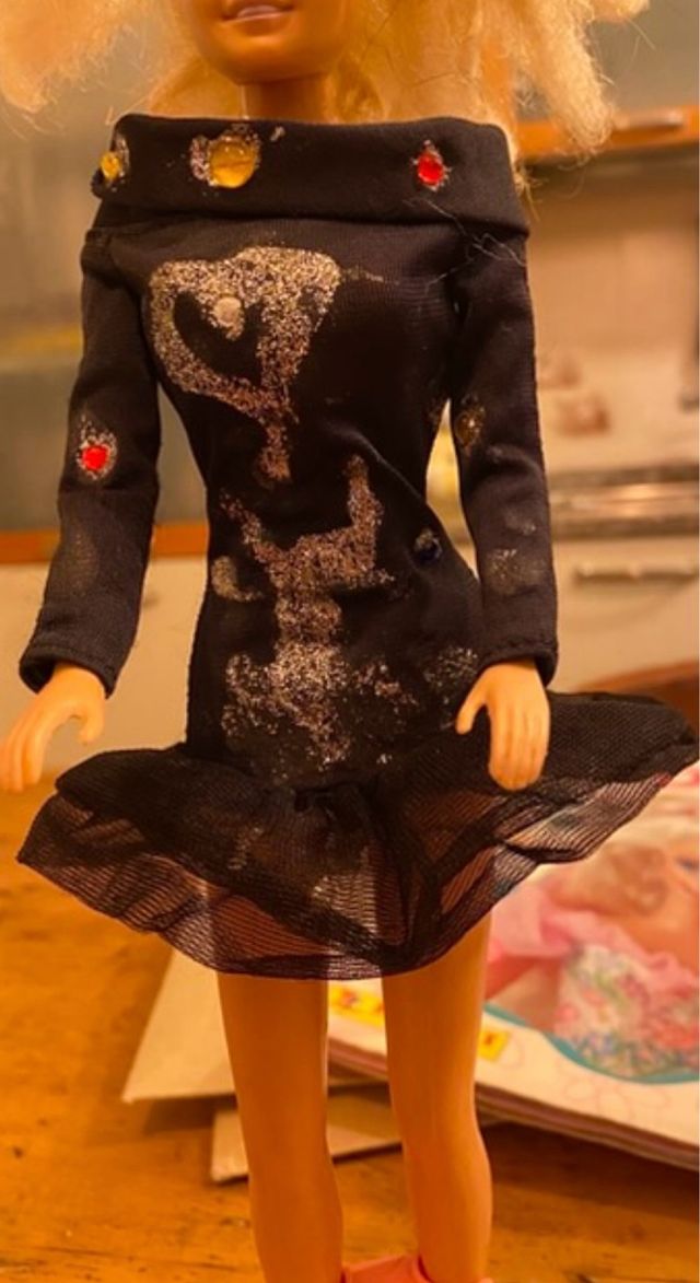 - Fantasia glitterata sul davanti, creata con glitter originali prodotti per decorare i vestiti di Barbie