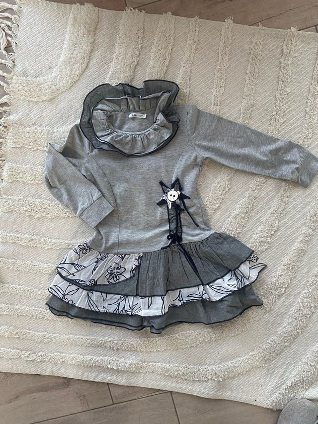 Dettagli del prodottoGrazioso abito da bambina in morbido tessuto grigio, perfetto per ogni occasione.
