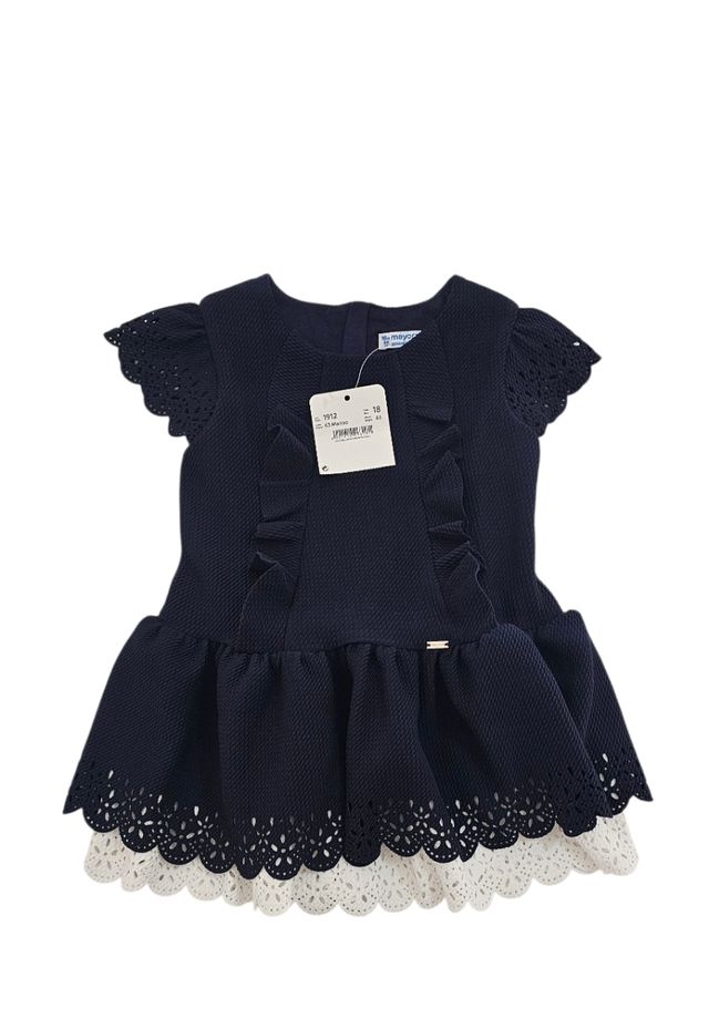 Bellissimo abito per bambina Mayoral, taglia 18 mesi. L'abito è nuovo ed è perfetto per un'occasione speciale. - Colore blu scuro - Dettagli in pizzo bianco - Vestibilità comoda