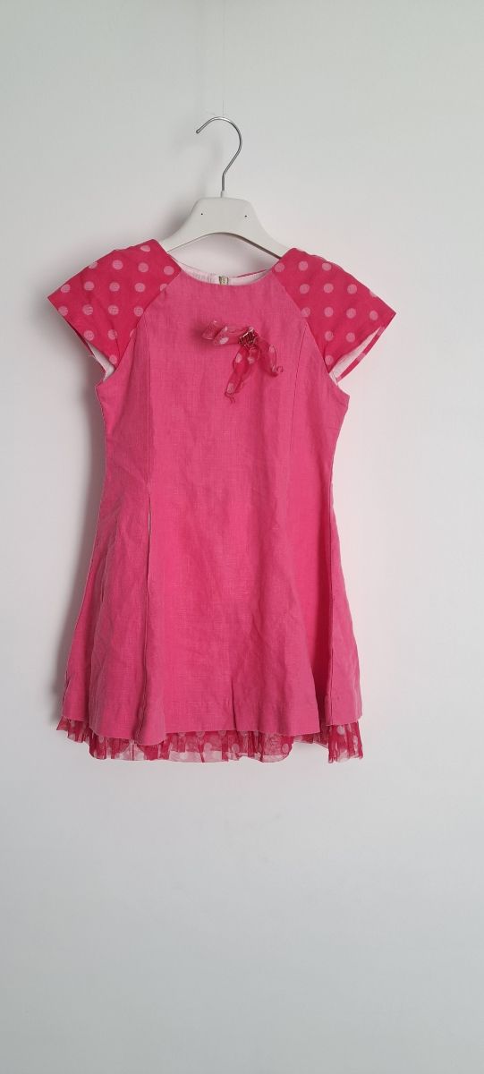 Dettagli del prodottoBellissimo abitino estivo per bambina del marchio VDP. L'abito è fuxia, in lino, con dettagli a pois bianchi sulle maniche. Ha una fodera e un fiocco/spilla decorativo sul davanti. Ha anche delle tasche. Perfetto per occasioni speciali o per tutti i giorni.