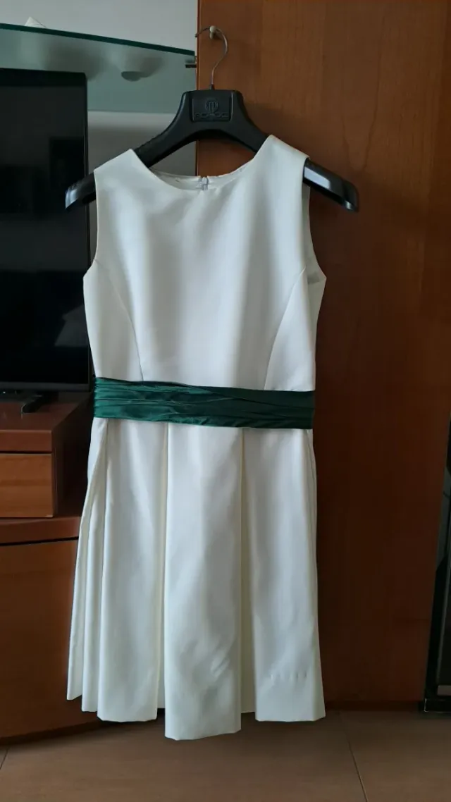 Dettagli del prodottoElegante abito da Damigella o prima comunione per bambina color di avorio. Fatto a mano per damigella con la stessa stoffa dell'abito da sposa. Presenta una cintura in tessuto di taffeta drappeggiato verde scuro che aggiunge un tocco di colore.