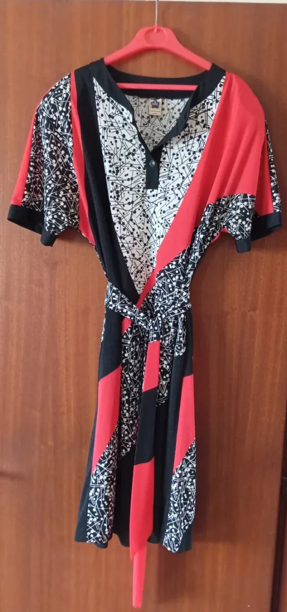 Elegante abito da donna del brand "ELLE" in misto seta con una vivace fantasia geometrica astratta nei colori rosso nero e bianco taglia 52.