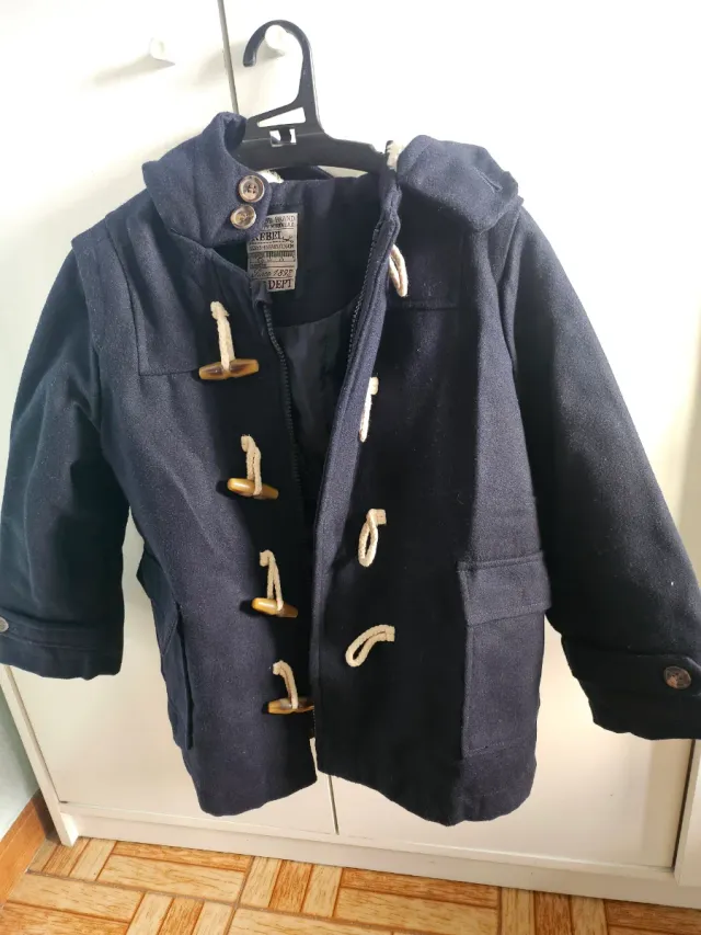 Dettagli del prodottoCappotto in panno per bambini in blu navy, perfetto per le giornate fredde. - Chiusura con cerniera e bottoni in legno. - Cappuccio integrato. Taglia 116 cm 4-5 anni - Tasche frontali. Regalo sciarpa La descrizione è stata tradotta automaticamente.