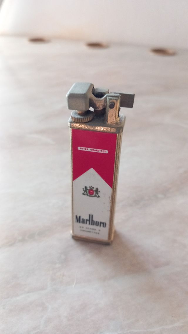 Accendino in acciaio della malboro. Con finiture dirate un pochino consumate dal tempo. Ma fa ancora la sua ottima figura