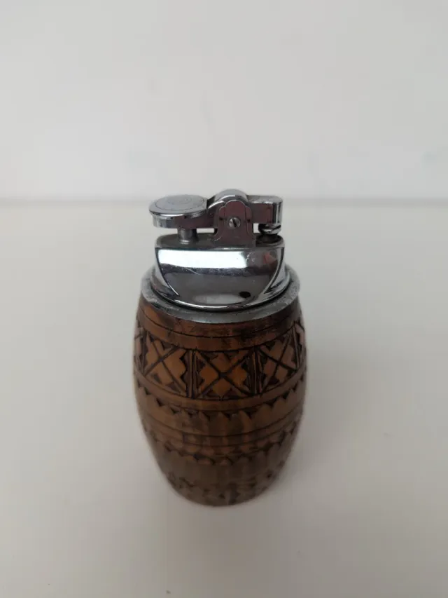 Accendino da tavolo con un design unico in legno intagliato. - Materiale: Legno - Design: Intagliato Misura cm 10x6 diametro