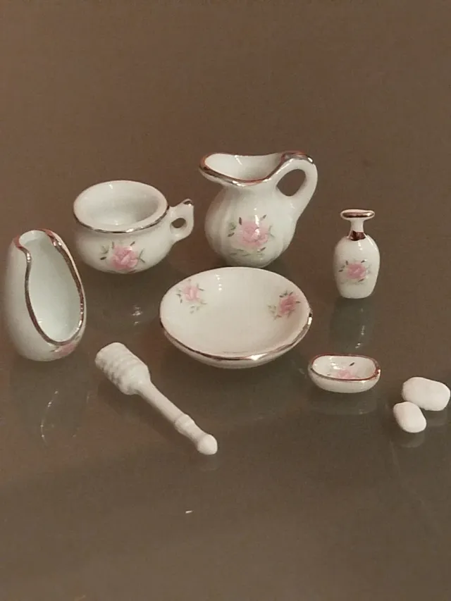 Dettagli del prodottoSet di accessori da bagno in miniatura in stile vintage, per collezionismo, casa delle bambole. Tutto in ceramica tranne i saponi e la spazzola. Scala 1/12 La descrizione è stata tradotta automaticamente.
