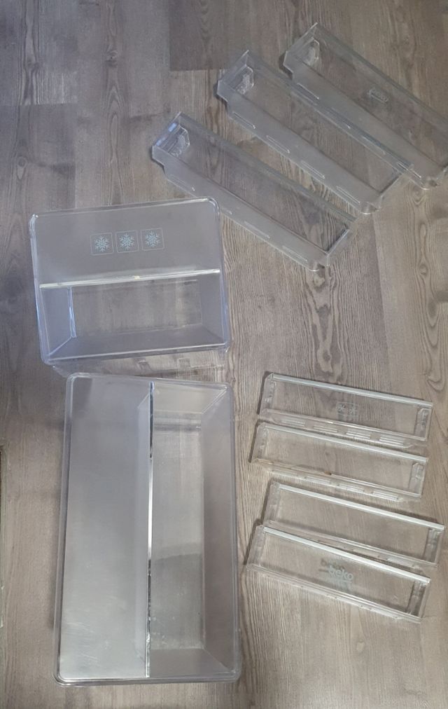 Dettagli del prodottoSet di accessori in plastica trasparente per frigorifero Beko Americano. Include diversi cassetti e ripiani in vetro.