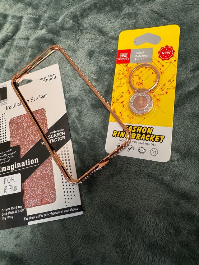 Dettagli del prodottoSet di accessori per iPhone 6 Plus. - Custodia protettiva con finitura brillante. - Anello metallico girevole per il cellulare. - Anello protettivo esterno con brillanti e serpente. La descrizione è stata tradotta automaticamente.