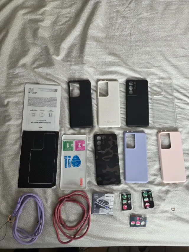Dettagli del prodottoSet di accessori per Samsung Galaxy S21 Ultra. - Custodia nera opaca. - Custodia bianca. - Custodia nera con design delle fotocamere. - Custodia trasparente. - Custodia con design mimetico. - Custodia lilla. - Custodia rosa. - Protezione per lo schermo. - Cordini per cellulare (viola e rosa). - Accessori per fotocamere. Il prezzo include tutto ciò che è nella foto. Accessori venduti separatamente a 5€ l'unità La descrizione è stata tradotta automaticamente.