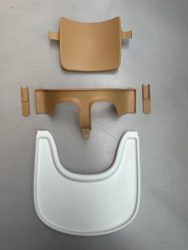 Dettagli del prodottoSet di accessori per la seggiolina Stokke Tripp Trapp. Include: - Vassoio in plastica bianca. - Schienale e barra di sicurezza in beige. - Set di cursori anti-caduta. La descrizione è stata tradotta automaticamente.