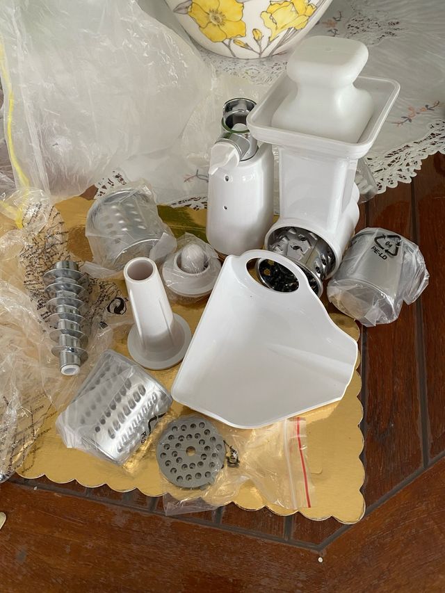Dettagli del prodottonon so esattamente di quale robot da cucina facessero parte poiche’ io li compro, non li uso e quindi per fare spazio li rivendo. presumo siano del robot tritacarne rgv che non ho piu’. date una occhiata se per caso usate il tritacarne e li riconoscete: credo siano per fare tutto, anche per verdure, per grattuggiare il parmigiano, per fare salsicce e lavorare i pomodori. li avevo comprati successivamente ed anche questi accantonati e mai usati. sono molto costosi presi singolarmente. li vendo in blocco a 50€ oppure a singolo pezzo se ve ne interessa uno in particolare. li rivendo a meno del 50% del loro prezzo seppur nuovissimi.
