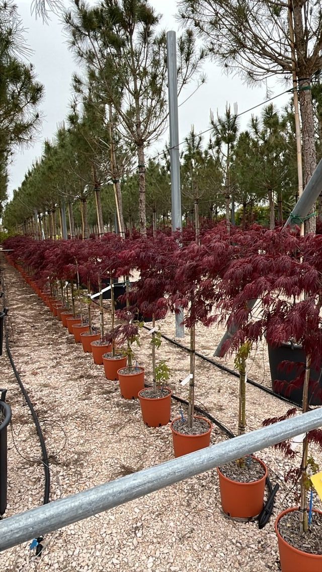 Arbolito caducifolio de porte colgante y crecimiento lento, alcanza 1,5–2 m de alto y ancho, con copa en cascada muy ornamental. Hojas profundamente divididas, rojo oscuro en primavera y verano, que se transforman en un rojo escarlata intenso en otoño. Prefiere semisombra o sombra ligera y suelos fértiles, bien drenados. Resistente y fácil de mantener, requiere riegos regulares sin encharcar y solo podas ligeras para conservar la forma. Muy valorado en jardines pequeños, borduras, rocallas o en maceta. Misure del prodotto