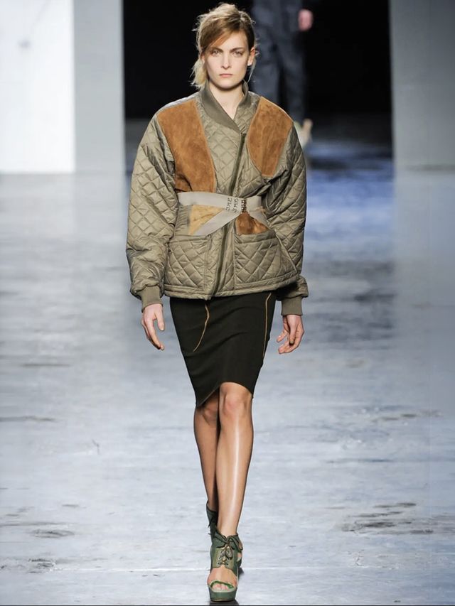 Acne Studios "Sinclair" quilted bomber jacket from the Autumn/Winter 2012 collection, corresponding to a pre-production prototype of Look 17. Constructed from a green nylon quilted shell. The design features an asymmetrical front zip closure, a ribbed collar, ribbed cuffs, and contrasting brown suede patches on the chest and front pockets. The garment is accompanied by a matching structured waist belt featuring suede panels and a hook-and-eye back closure.