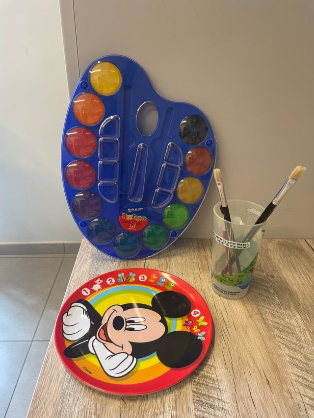 Dettagli del prodottoacquarelli Primo 12 colori. sono stati aperti e credo usati una sola volta il verdino vicino al colore senape ed il giallo vicino all’arancio. il resto dei colori sono nuovi. Dentro non ci sono i pennelli originali, ma si regalano 4 pennelli della giotto : 3 sono nuovi di cui uno rosso, uno nero nr 8, un’altro nero nr. 10 ed infine il nr. 6 usato. Si include anche un piattino della disney e un bicchierino expo. Misure del prodotto