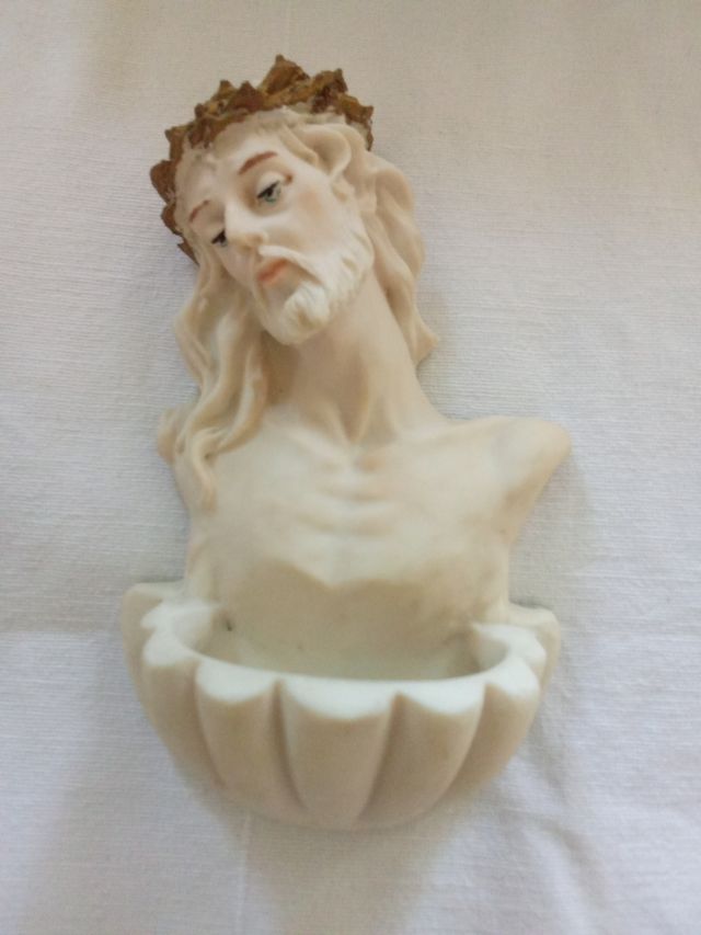 Dettagli del prodottoBellissima acquasantiera da parete, raffigurante il volto di Gesù con corona di spine.